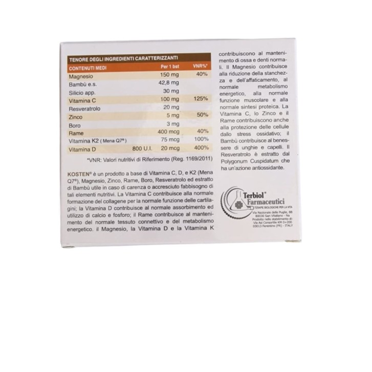Kosten è un integratore alimentare a base di vitamina C, D e K2 (Mena Q7), magnesio, zinco, rame,boro, resveratrolo ed estratto di bambù utile in caso di carenza o accresciuto fabbisogno di tali elementi nutritivi. La vitamina C contribuisce alla normale formazione del collagene per la normale funzione delle cartilagini; la vitamina D contribuisce al normale assorbimento ed utilizzo di calcio e fosforo; il rame contribuisce al mantenimento del normale tessuto connettivo e del metabolismo energetico. Il magnesio, la vitamina D e la vitamina K contribuiscono al mantenimento di ossa e denti normali. Il magnesio contribuisce alla riduzione della stanchezza e dell'affaticamento, al normale metabolismo energetico, alla normale funzione muscolare e alla normale sintesi proteica. La vitamina C, lo zinco e il rame contribuiscono anche alla protezione delle cellule dallo stress ossidativo; il bambù contribuisce al benessere di unghie e capelli. Il resveratrolo è estratto dal Polygonum cuspidatum che ha un'azione antiossidante.