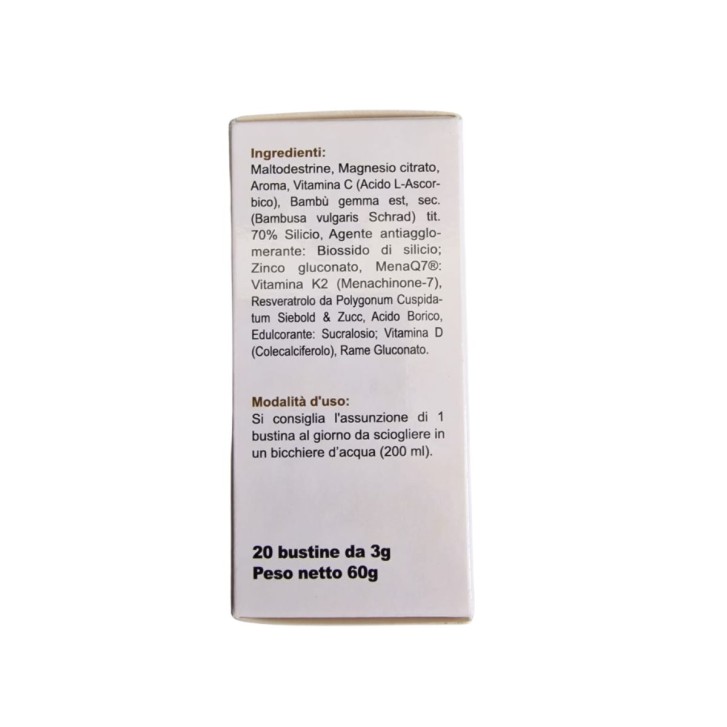 Maltodestrine, magnesio citrato, aroma, vitamina C (acido L-ascorbico), bambùgemma e.s. (Bambusa vulgaris Schrad) tit. 70% silicio; agente antiagglomerante: biossidodi silicio; zinco gluconato, MenaQ7, vitamina K2 (menachinone-7), resveratrolo daPolygonum cuspidatum Siebold & Zucc., acido borico; edulcorante: sucralosio; vitamina D(colecalciferolo), rame gluconato. Senza glutine e lattosio.