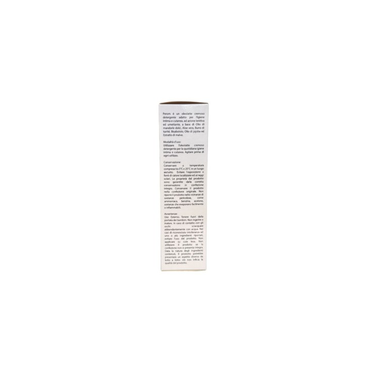 Perom è un oleolatte cremoso detergente adatto per l'igiene intima e cutanea, ad azione lenitiva ed umettante, a base di Olio di mandorle dolci, Aloe vera, Burro di karité, Bisabololo, Olio di jojoba ed Estratto di malva.
