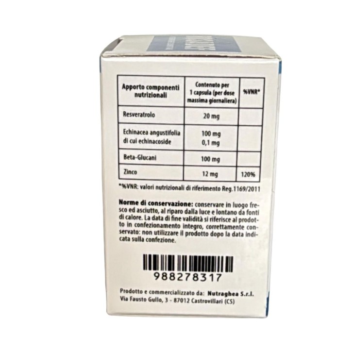 Echinacea angustifolia DC. (radice e.s.) 1:2 titolato allo 0,1% in echinacoside, Betaglucani da lievito (Saccharomyces cerevisiae), Resveratrolo (radi-ce e.s.) da Polygonum cuspidatum 98%, Zinco Ossido, Idrossipropilmetilcellulosa. Agenti antiagglomeranti: Biossido di Silicio, Sali di Magnesio degli acidi grassi; Agente di carica: Cellulosa microcristallina.
