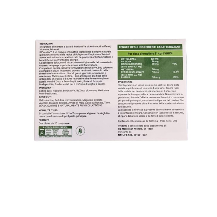 Cistina base, Piceidox, biotina (vitamina B), zinco gluconato, metionina, ferro bisglicinato; eccipienti: maltodestrine, cellulosa microcristallina, magnesio stearato vegetale, biossido di silicio, amido di mais, calcio carbonato, talco. Senza glutine. Naturalmente privo di lattosio.